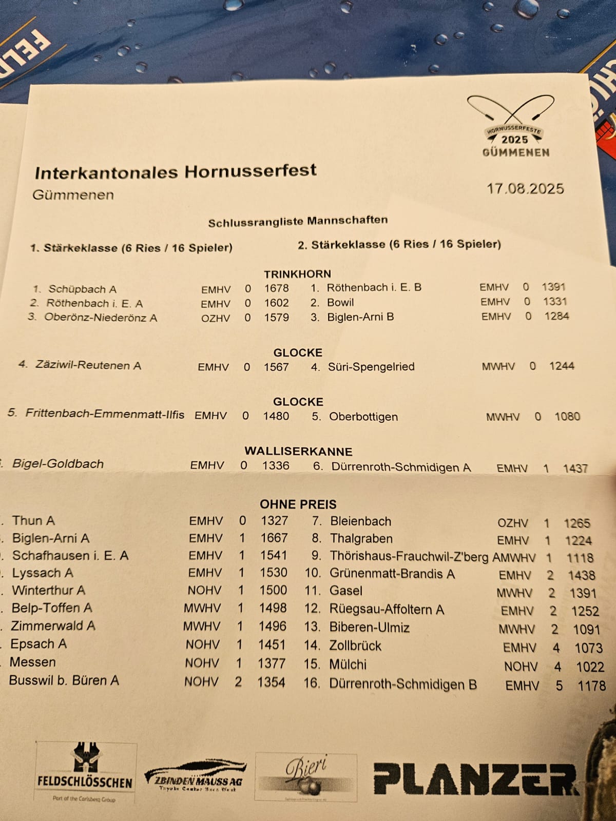 Nach dem geglückten Start und dem 6. Zwischenrang, war allen klar das etwas möglich ist, wenn wir bis am Abend keinen Nummer zuliessen. Motiviert starteten wir so in den Ausstich, welchen wir auch gegen die HG Süri-Spengelried austrugen. Leider wurde uns eine 10 zum Verhängnis, die nicht von allen gesehen wurde und so den Weg unabgetan auf den Boden fand. So mussten wir uns die einzige Nummer des Tages schreiben lassen. Am Abend war dann der 8. Rang klare Sache und so verpassten wir knapp die Ränge mit Auszeichnung. Erfreulich war der Rangkranz von König Mathias auf dem Rang 25 und den beiden Kranzgewinnern Rothenbühler Niklaus und Muster Michael. So ging das interkantonale in Gümmenen für uns zu Ende. Weiter geht’s dann nächsten Samstag 23.08.2025 am emmentalischen in Rüdtligen-Alchenflüh.