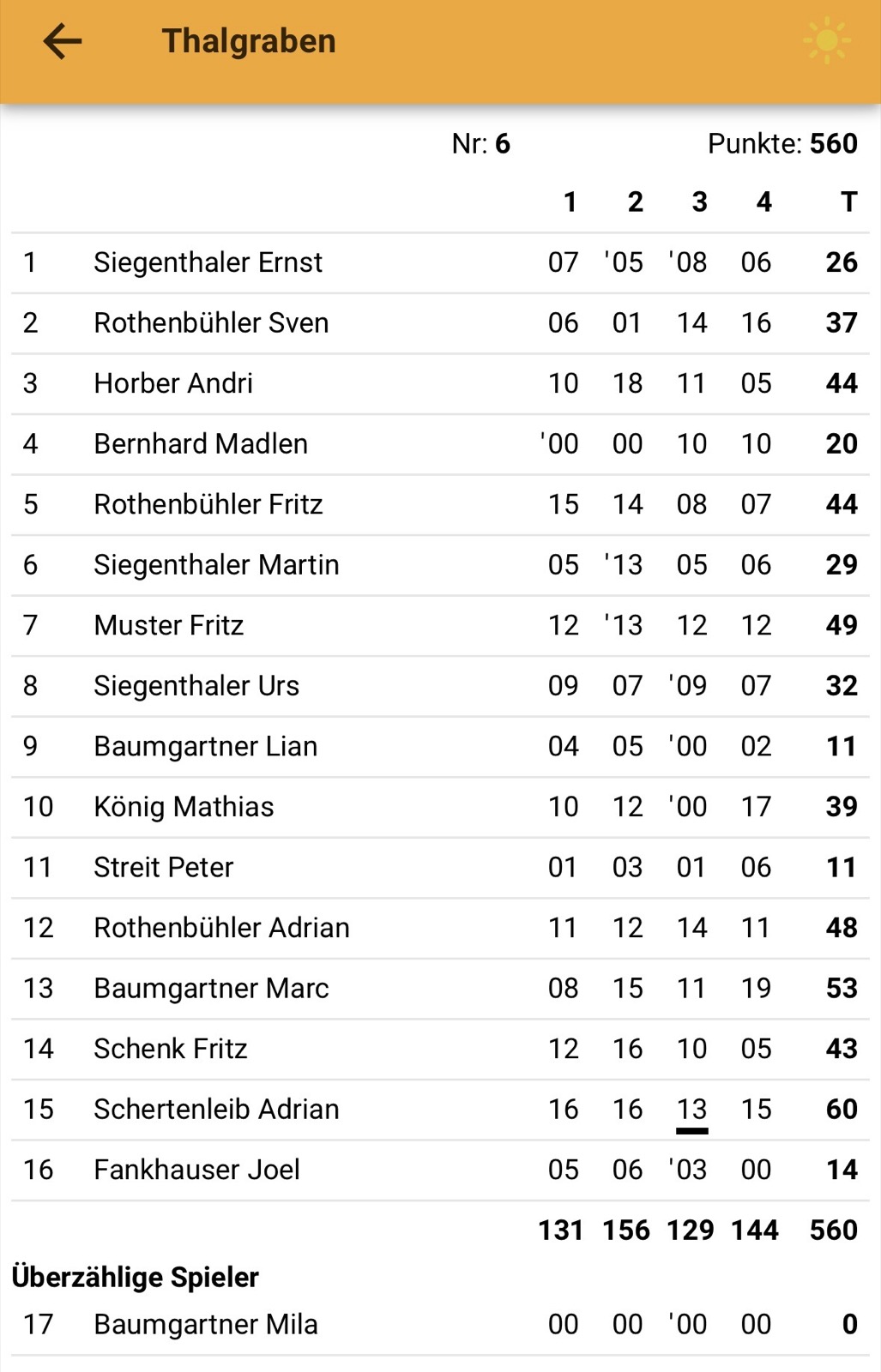 Trotz guten Bedingungen gelang es uns nicht das Spiel ohne Nummero zu beenden, gleich 6 Streiche wurden unterstrichen. Nicht der erhoffte Start in die neue Saison. Auch am Bockstand lief es nicht wie gewünscht. So war der 6. Rang für uns Tatsache.